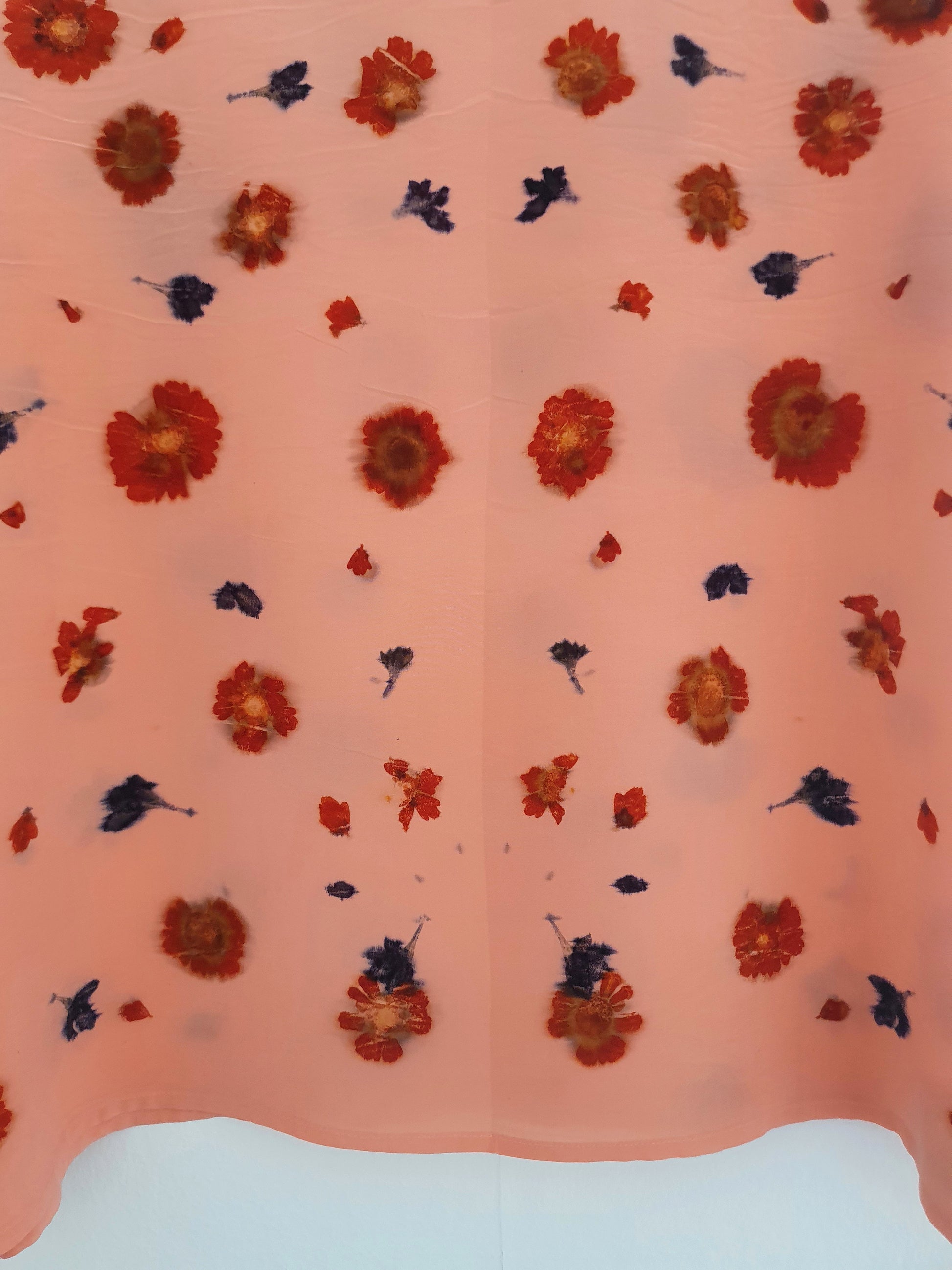 Originally peach, now upcycled with eco prints from coreopsis and blacknight scabiosa flowers grown and harvested from our dye garden in Dublin